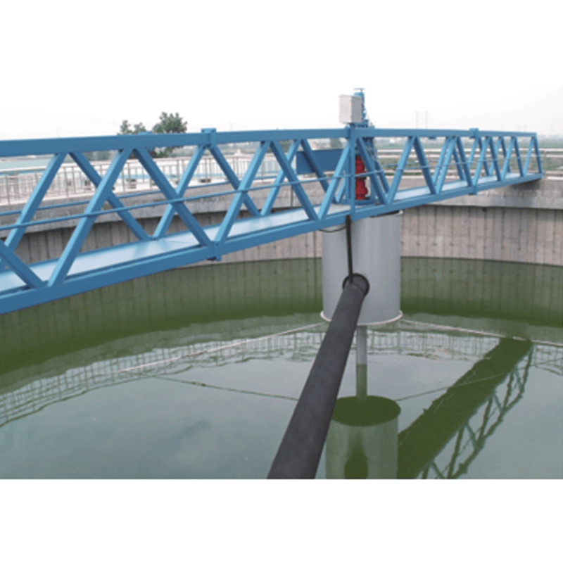 懸掛式中心傳動刮泥機主要由減速驅動機構、中心傳動裝置、刮泥系統、水下軸承及集泥槽等部件組成,整臺刮泥機的荷載都作用在固定橫跨池徑的工作橋上。適用于給排水過程中水廠或污水處理廠直徑一般不大于20m的輻流式(圓形)沉淀池的污泥刮集和排除。